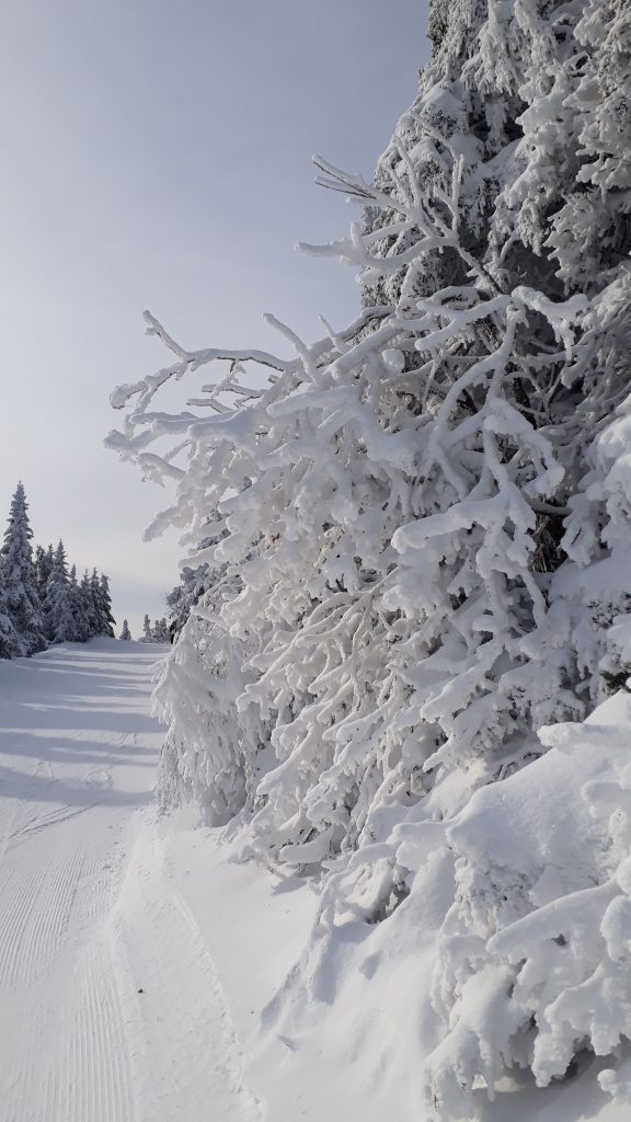 Le paysage est magnifique : je suis passée sur des pistes qui me permettaient d’admirer la vallée, par des pistes plus ombragées avec des arbres ensevelis sous la neige…. J’ai pris mon temps pour découvrir tout cela. Par contre, le froid ne m’a guère laissé l’opportunité de prendre des photos.