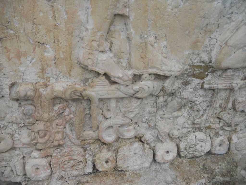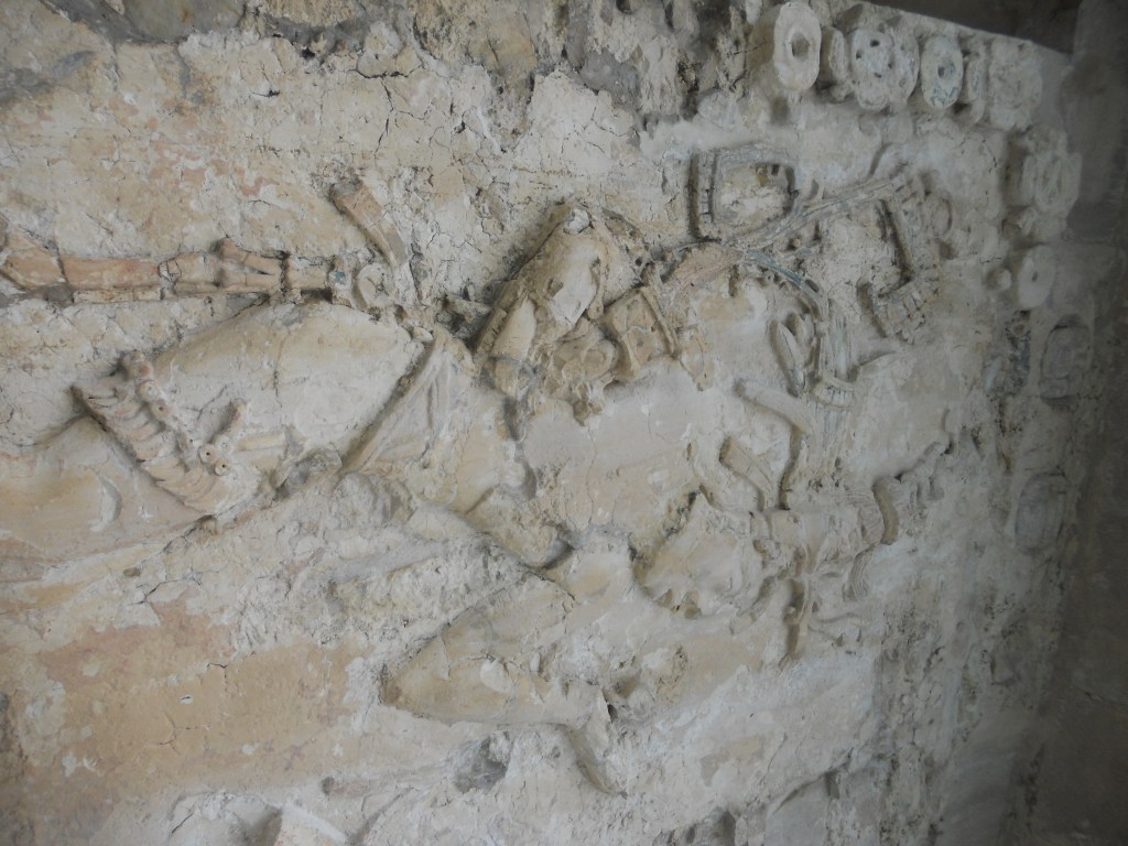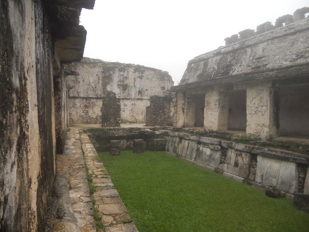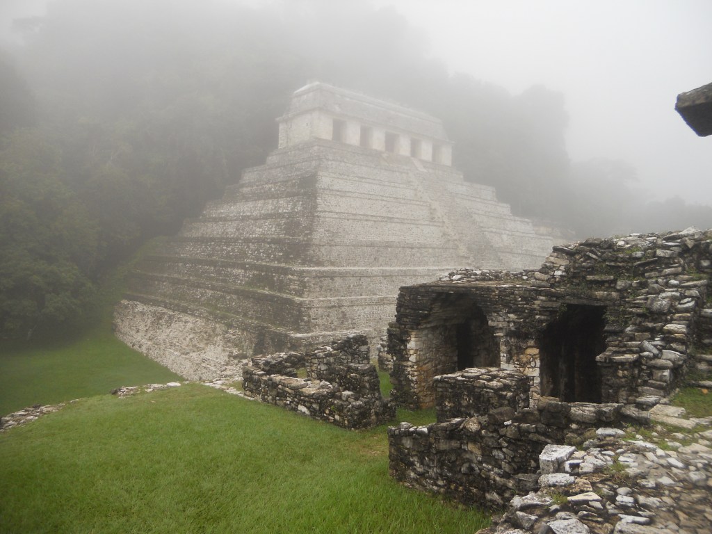 Je commence par les pyramides se trouvant à droite dès l’entrée. Au sommet d’une des pyramides se situe el Templo de las Inscripciones. Il s’appelle ainsi à cause des inscriptions qui y ont été retrouvées. Dans ce temple, un escalier descend à l’intérieur de la pyramide. Celle-ci contenait une crypte funéraire abritant le tombeau de roi Pakal. Un sarcophage impressionnant y a été retrouvé avec des bijoux et toutes sortes d’objets à l’intérieur. Une reproduction de celui-ci est au musée. Le masque de jade retrouvé lui aussi à l’intérieur du tombeau est quant à lui exposé au Musée National d’Anthropologie de la Mexico.