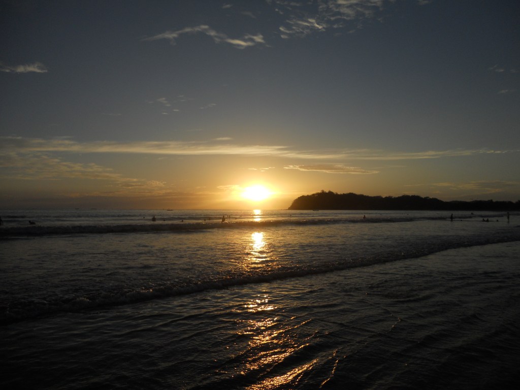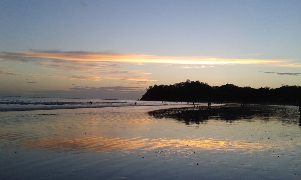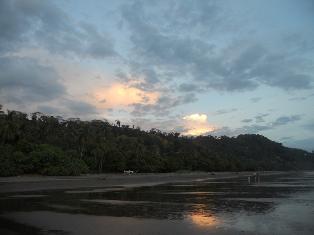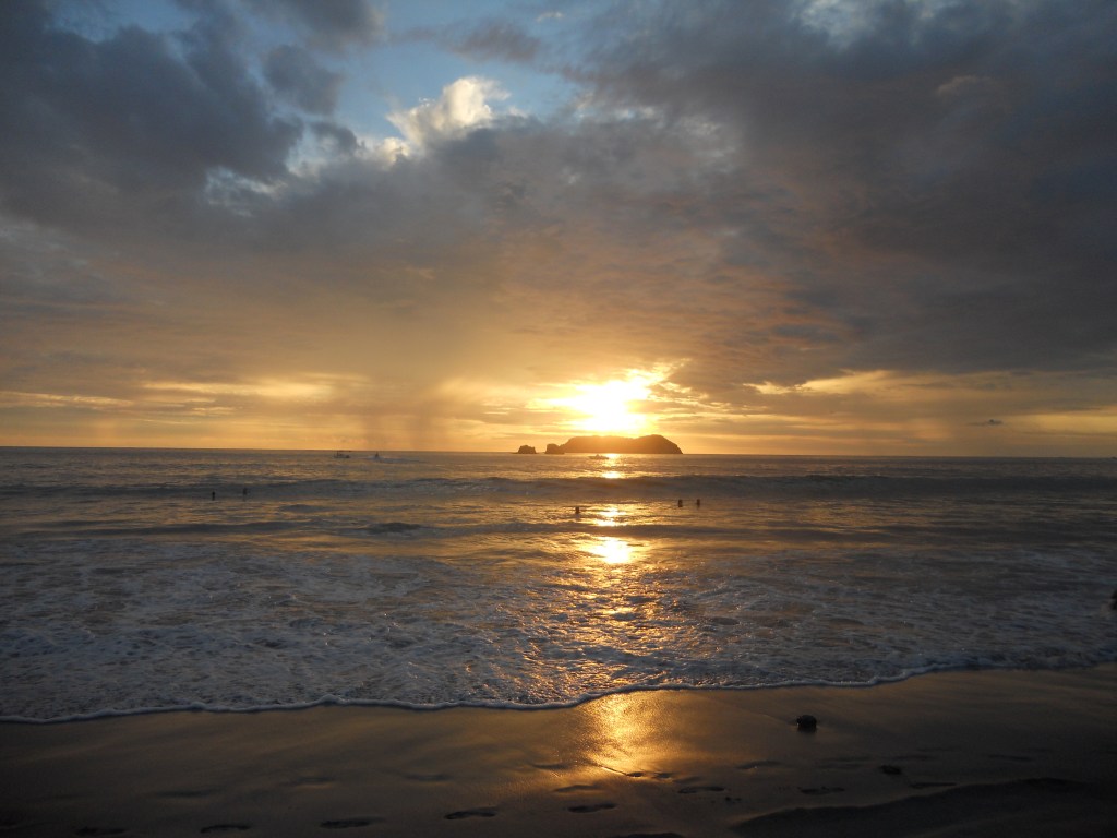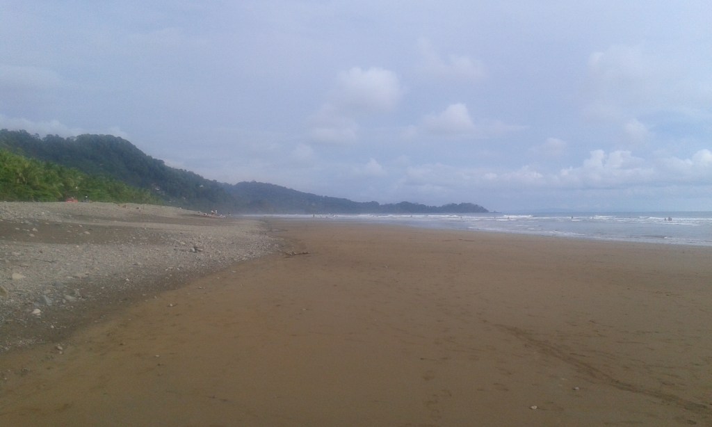 J’ai choisi de continuer mon voyage à Dominical. La plage est très connue des surfeurs ! Quand je suis arrivée dans l’après-midi, il pleuvait, donc je suis restée à l’auberge de jeunesse, faire des connaissances. Dès qu’il s’est arrêté de pleuvoir, je suis allée à la plage. La pluie avait inondé tous les chemins, je marchais littéralement dans l’eau boueuse. La plage est très belle : une énorme étendue de sable, de grandes vagues et les reflets du soleil dans l’eau ! L’ambiance est très cool aussi entre les surfeurs, les personnes qui lisent et celles qui font du yoga sur la plage !