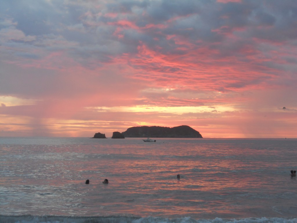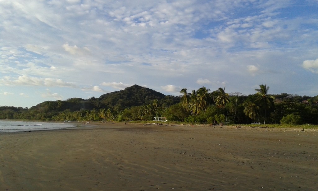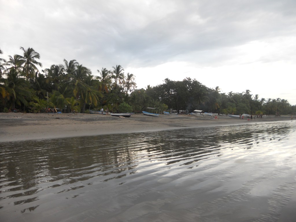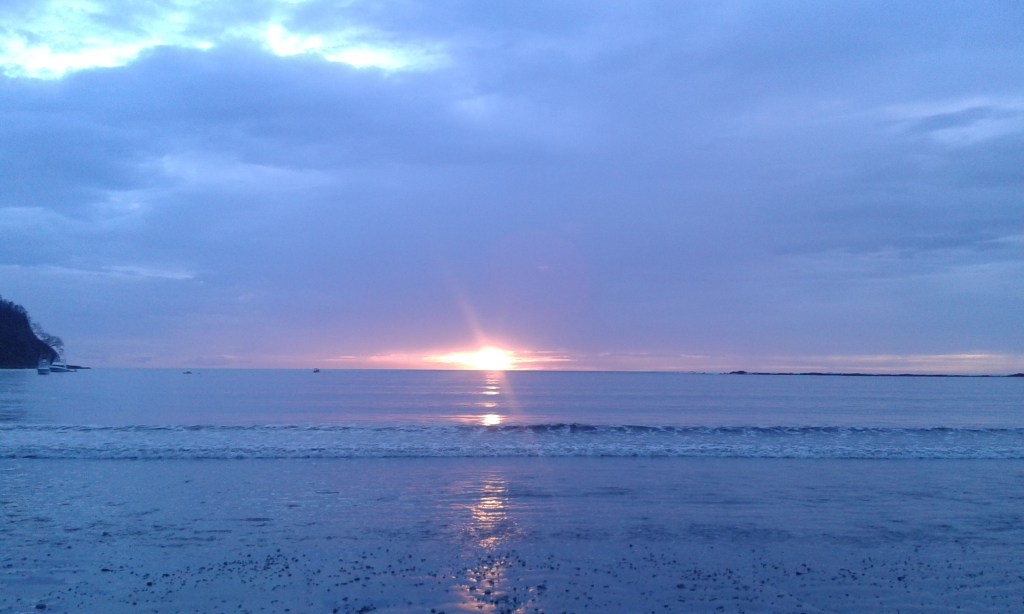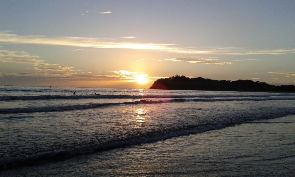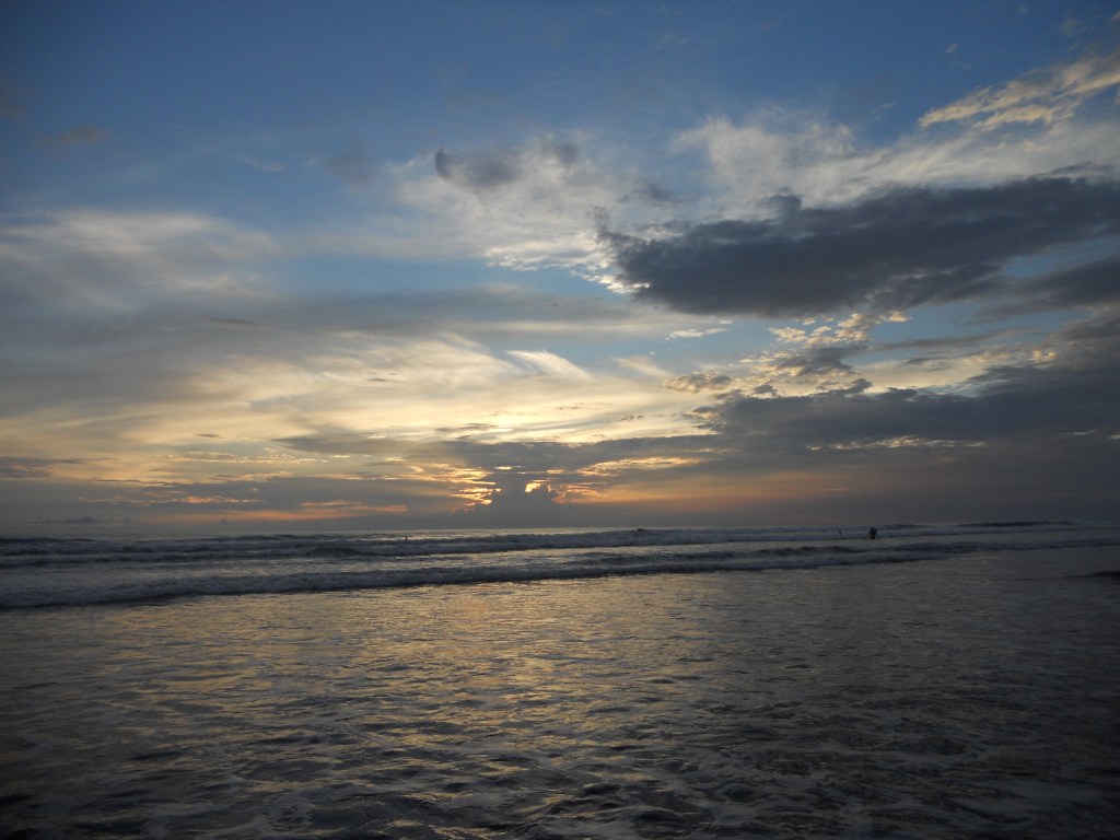 J’ai choisi de continuer mon voyage à Dominical. La plage est très connue des surfeurs ! Quand je suis arrivée dans l’après-midi, il pleuvait, donc je suis restée à l’auberge de jeunesse, faire des connaissances. Dès qu’il s’est arrêté de pleuvoir, je suis allée à la plage. La pluie avait inondé tous les chemins, je marchais littéralement dans l’eau boueuse. La plage est très belle : une énorme étendue de sable, de grandes vagues et les reflets du soleil dans l’eau ! L’ambiance est très cool aussi entre les surfeurs, les personnes qui lisent et celles qui font du yoga sur la plage !